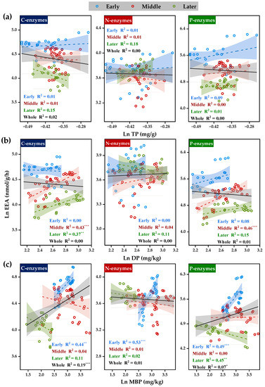 There was no significant correlation between EEAs and TP during the transformation of plant residues (Figure 5a). C- and P-enzymes were significantly and positively correlated with DP in the middle stage (Figure 5b). However, N-enzymes exhibited an insignificant correlation with DP. N-enzyme showed a significant positive correlation with MBP only in the early stage, while C- and P-enzymes showed a significant positive correlation with MBP throughout the observed stages (Figure 5c).