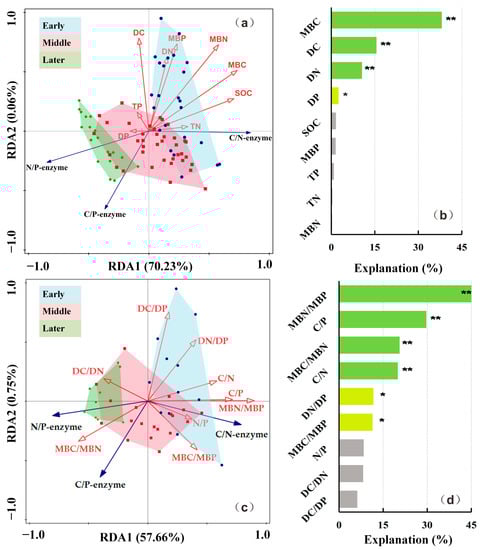 Redundancy analysis (RDA) identifies the relationships between extracellular enzyme activities (EEAs) and (a,b) microbial biomass, total nutrients, dissolved nutrients, and (c,d) their stoichiometry. * p < 0.05, ** p < 0.01.