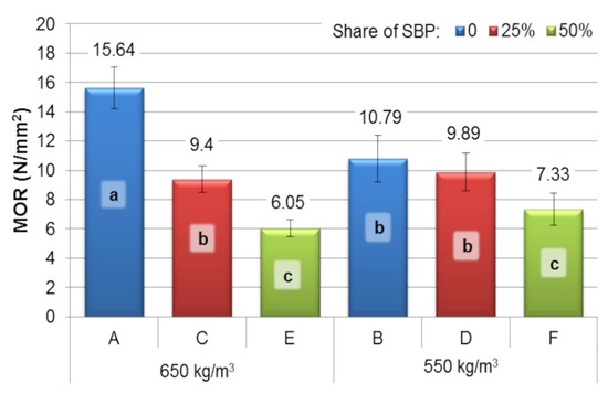 The technical requirements of particleboards, depending on their intended use, are compiled and described in the EN 312 standard [40]. The minimum value of modulus of rupture for particleboards intended for general purpose and use in dry conditions (P2 type boards) is 10 N/mm2. When analyzing the results presented in Figure 1, it can be concluded that none of the particleboards made with SBP met these requirements. However, it should be noted that the variants with a 25% SBP share were characterized by a strength of at least 9.4 N/mm2 regardless of the density. Similar dependencies were noted by Borysiuk et al. [33].