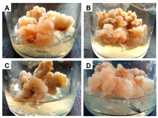 Various methods have been attempted to induce and simultaneously decrease the duration of agarwood formation artificially. Most studies relied on artificially infecting the tree with fungi inoculation [3,4,5]. Several fungal species have been demonstrated to trigger the formation of agarwood in Aquilaria successfully, i.e., Aspergillus niger [6], Fusarium solani [5,6,7], Lasiodiplodia sp. [8], and Rigidoporus vinctus [9]. Notably, these fungi were also reported to be efficient in inducing agarwood formation in other agarwood-producing genera, namely Gyrinops, indicating its potential use in multiple agarwood-producing species [7]. Induction of agarwood formation by fungi is promising, but resin accumulation still takes years. An alternative induction method is highly desirable given the high demand for agarwood and the need to protect agarwood trees, and in vitro culture may be a promising platform for producing the secondary metabolite relatively faster.