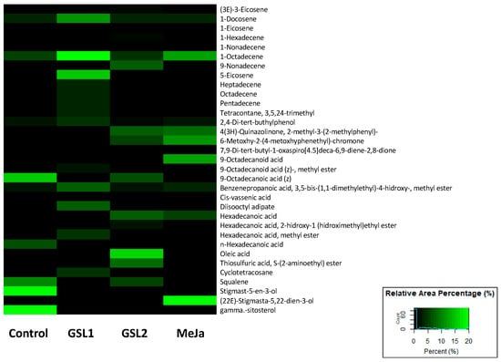 Heatmap of the secondary metabolites abundance of ethyl acetate extracts 20 days after A. malaccensis callus treatment with elicitor derived from F. solani strain GSL1 or GSL2 mycelium, or MeJA. The abundance of the detected compound was presented in a color gradient, with green being the highest and black being the lowest.