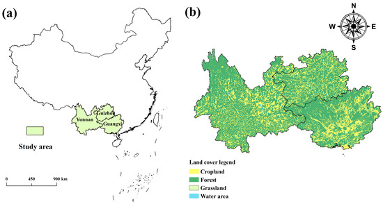 The targeted area is Yunnan, Guizhou, and Guangxi provinces in Southwest China (Figure 1a), with 806,900 km2. Southwest China is characterized by complex terrain structures, mainly plateaus, basins, and mountainous regions. The annual average temperature is between 0~24 °C and the annual precipitation of more than 900 mm [23,24]. The southwest area is prone to drought events in the fall and winter. The ecosystem is very fragile and vulnerable to human activities and climate change [25,26,27]. Regional vegetation types are mainly forest, cropland, and grassland (Figure 1b). The vegetation coverage rate in this region is very high, with more than 60% of the area being forested.