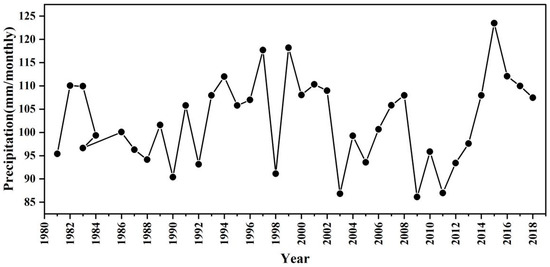 The monthly temperature (Tmpt) and precipitation (P) data with a 1 km resolution in China from 1981 to 2019 come from the National Earth System Science Data Center. Unit of precipitation is mm. Data can be obtained from the National Earth System Science Data Center, National Science and Technology Infrastructure of China (http://www.geodata.cn) (accessed on 25 December 2022).