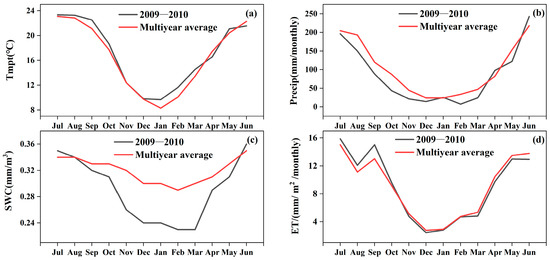 Regional mean interannual variation in (a) temperature (b) precipitation (c) soil moisture and (d) ET in three provinces from July 2009 to June 2010. (The red line shows the monthly average from July 2009 to June 2010, and the black line indicates the multiyear monthly average from 2000 to 2019 (ET is from 2000 to 2015)).