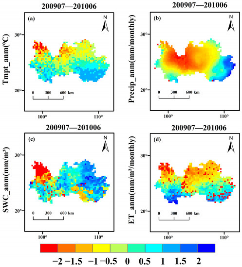 The spatial distributions of the anomalies of (a) temperature, (b) precipitation, (c) soil moisture, and (d) ET in three provinces in the southwest from July 2009 to June 2010.