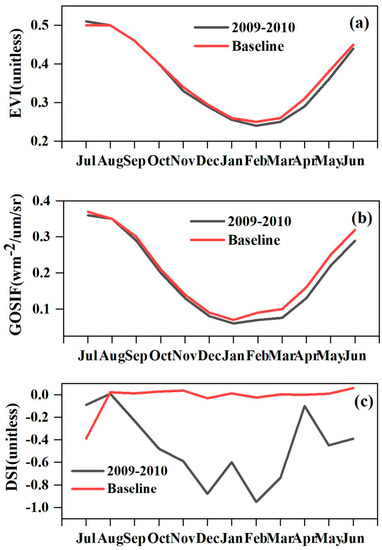 The interannual changes in remote sensing indicators, including EVI, SIF, and DSI from July 2009 to June 2010 were analyzed.