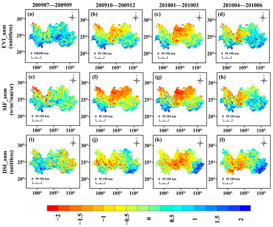 The spatial distributions of the anomalies of (a–d) EVI, (e–h) SIF, and (i–l) DSI over three provinces in July–September (first column), October–December (second column), January–March (third column), and April–June (fourth column) in 2009–2010.