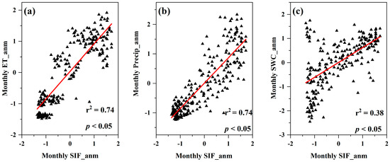 Relationships between SIF anomalies and drought indicators: (a) monthly SIF anomalies and P anomalies, (b) monthly SIF anomalies and ET anomalies, (c) monthly SIF anomalies and SWC anomalies. The correlation coefficients (R2) and p values are provided in each figure.