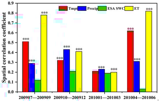 Spatial consistency between SIF anomalies and anomalies of temperature, precipitation, SWC, and evapotranspiration in 2009/2010 (*** indicates p level of 0.05).