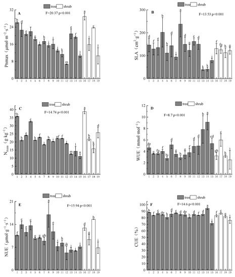 Comparison of mean value of maximum net photosynthetic rate (Pnmax, (A)), specific leaf area (SLA, (B)), leaf nitrogen content (Nmass, (C)), water use efficiency (WUE, (D)), nitrogen use efficiency (NUE, (E)), and carbon use efficiency (CUE, (F)) among different species (mean ± SE). Different small letters indicate significant difference between life forms for the same resource utilization efficiency (p < 0.05).