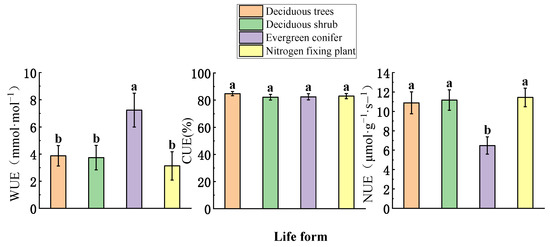 Comparison of mean value of water use efficiency (WUE), nitrogen use efficiency (NUE), and carbon use efficiency (CUE) between life forms (mean ± SE). Different small letters indicate significant difference between life forms for the same resource utilization efficiency (p < 0.05).