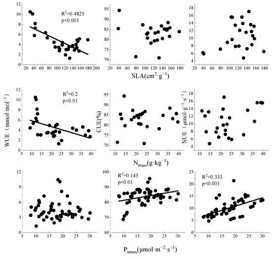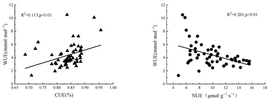 In leaves, plant resource use efficiency changed with functional traits, especially Nmass, SLA, and Pnmax. The first two parameters predict the WUE [27]. In this study, WUE was significantly negatively correlated with Nmass and SLA, which corroborates previous studies. However, there was no significant relationship between WUE and Pnmax, possibly because changes in the allocated biomass by leaves per unit caused both corresponding changes in photosynthetic capacity and affected transpiration. CUE and NUE were positively correlated with Pnmax. Leaf CUE, as an important indicator of leaf carbon balance, results from the comprehensive effects of photosynthesis and respiration [61]. In this study, Pnmax was positively correlated with Rd, and CUE was negatively correlated with Rd. This indicated a large increase in Rd, probably because respiration is more susceptible to changes than photosynthesis [13,61]. The extremely significant positive correlation between NUE and Pnmax (p < 0.001) was consistent with a previous study [66] and confirmed that the greater the allocation of photosynthetic nitrogen to the Rubisco enzyme, the higher the photosynthetic rate and production capacity. These findings indicate that the functional traits of plants represent their utilization of and adaptation to environmental resources.