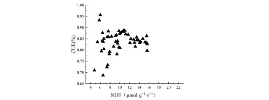 The CUE of different species ranged from 71.9% to 94.8%. The highest CUE was Pinus tabulaeformis (94.8%), and the lowest was Platyclus orientalis (71.9%). The CUE of other plants was between 80% and 89%, accounting for 89.5% of the total number of species (Figure 1F).