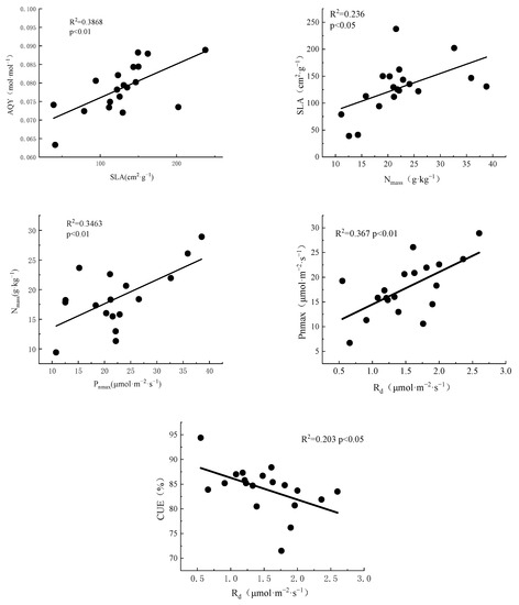 Relationship between specific leaf area (SLA) and apparent quantum yield (AQY), leaf nitrogen content (Nmass) of different species. Relationship between leaf nitrogen content (Nmass) and maximum net photosynthetic rate (Pnmax) of different species. Relationship between dark respiratory rate (Rd) and maximum net photosynthetic rate (Pnmax), carbon use efficiency (CUE) of different species.