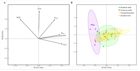 The results of the principal component analysis showed that the interpretation rates of principal component 1 and principal component 2 were 47.16% and 25.9%, respectively, with a total of 73.06%. Principal component 1 had a high correlation with SLA, Nmass, and NUE, which all had a positive correlation. Principal component 2 was highly correlated with WUE, CUE, and Pnmax, which all had a positive correlation (Figure 7, Table 4). As shown in Figure 7, evergreen coniferous trees are located in the negative area of the first principal component axis and the second principal component axis, with higher WUE and CUE. Nitrogen fixing plants are mainly located in the positive part of the first principal component axis, with higher Nmass, NUE, and SLA. Deciduous trees and deciduous shrubs are partly distributed in the positive area of the main axis and partly in the negative area.