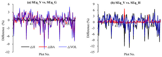 The plot-level differences in the estimates of H, G, and V between the simultaneous equations of the fir forest: (a) SEq_V vs. SEq_G, (b) SEq_V vs. SEq_H.