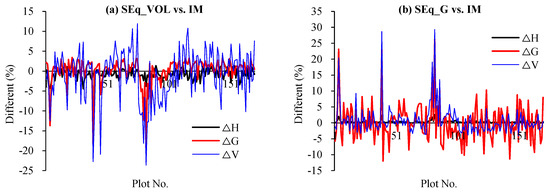 The plot-level differences of the estimates of H, G, and V between the SEqs and the IMs of the pine forests: (a) H and G were used as the endogenous variables to estimate V; (b) H and V were used as the endogenous variables to estimate G.