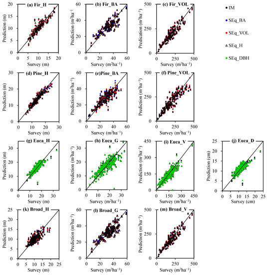 Although there were some differences in the estimates of forest attributes between the SEqs and IMs, and among the SEqs themselves, the estimations of all forest attributes of all forest types were good for both the IMs and SEqs (Figure 4).