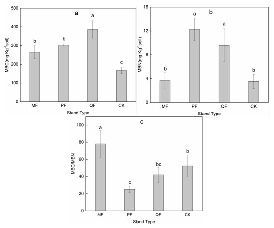 Soil MBC (microbial biomass carbon) (a), MBN (microbial biomass nitrogen) (b) and MBC/MBN (c) of three typical water-conservation forests. MF: Pinus massoniana-Quercus variabilis mixed forest; PF: Pinus massoniana forest; QF: Quercus variabilis forest; CK: non-forest land. Data are means ± standard errors, and different lower-case letters indicate significant differences among stand types (p < 0.05).