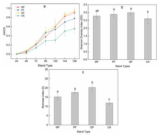 AWCD (average well color development) (a), Shannon diversity index (b) and community richness index (c) of soil microorganisms in three typical water-conservation forests. Data are means ± standard errors, and different lower-case letters indicate significant differences among stand types (p < 0.05). MF: Pinus massoniana-Quercus variabilis mixed forest; PF: Pinus massoniana forest; QF: Quercus variabilis forest; CK: non-forest land. Data are means ± standard errors, and different lower-case letters indicate significant differences among the treatments (p < 0.05).