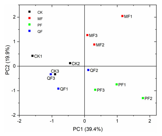 The PCA (principal component analysis) for carbon source utilization of soil microbial communities in three typical water-conservation forests. MF represents mixed forest; PF represents Pinus massoniana forest; QF represents Quercus variabilis forest; and CK represents non-forest land. The numbers 1, 2, and 3 after the letter represent repetitions 1, 2, and 3, respectively.