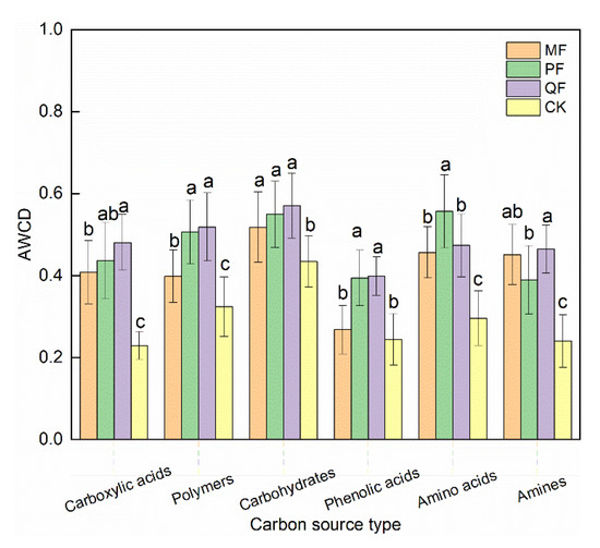 Utilization of six types of carbon sources (carboxylic acids, polymers, carbohydrates, phenolic acids, amino acids, and amines) by soil microorganisms in three typical water-conservation forests. MF: Pinus massoniana-Quercus variabilis mixed forest; PF: Pinus massoniana forest; QF: Quercus variabilis forest; CK: non-forest land. Data are means ± standard errors, and different lower-case letters indicate significant differences among stand types (p < 0.05).
