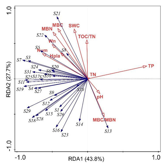 The redundancy analysis of the correlations between environmental factors and 31 carbon sources. pH: potential of hydrogen; SWC: soil water content; TN: total nitrogen; TP: total phosphorus; TOC: total organic carbon; MBC: microbial biomass carbon; MBN: microbial biomass nitrogen; Wn: alkali-hydro nitrogen; Num: number of plant species; represents Shannon diversity index of plants. S1: Pyruvic acid methyl ester; S2: Tween 40; S3: Tween 80; S4: α-cyclodextrin; S5: Glycogen; S6: D-cellobiose; S7: α-D-lactose; S8: β-methyl-D-glucoside; S9: D-xylose; S10: I-erythritol; S11: D-mannitol; S12: N-acetyl-D-glucosamine; S13: D-glucosaminiczcid; S14: α-D-glucose-1-phosphate; S15: L-α-glycerol phosphate; S16: D-galactonic acid lactone; S17: D-galacturonic acid; S18: 2-hydroxybenzoic acid; S19: 4-hydroxybenzoic acid; S20: γ-hydroxybutyric acid; S21: Itaconic acid; S22: α-ketobutyric acid; S23: D-malic acid; S24: L-arginine; S25: L-asparagine; S26: L-phenylalanine; S27: L-serine; S28: L-threonine; S29: glycyl-L-glutamic acid; S30: Phenylethylamine; S31: Putrescine.