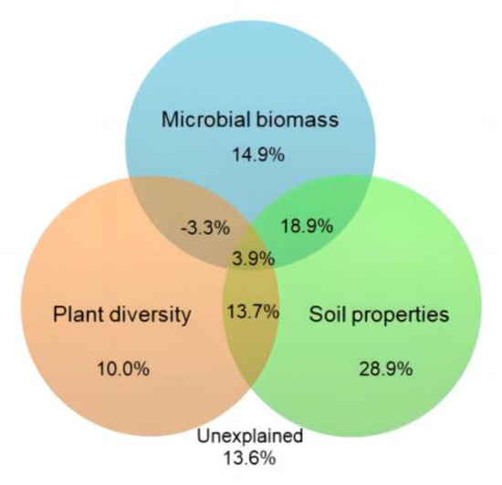 The VPA showed that three types of factors explained 86.4% of the variation, and plant (community) diversity, soil physicochemical properties and soil microbial biomass independently explained 10.0%, 28.9% and 14.9% of the variation, respectively (Figure 6). The variation explained by soil physicochemical properties was significantly higher than plant (community) diversity and soil microbial biomass, indicating that soil physicochemical properties was the most important factor affecting the carbon source utilization of the soil microbial community.