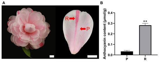 ‘Joy Kendrick’ petal phenotypes and pigmentation. (A) ‘Joy Kendrick’ petal in full-flower. R, red fractions; P, pink fractions. Bars = 1 cm. (B) Anthocyanin content of red (R) and pink (P) samples, and expressed in micromolar per gram fresh weight. Statistical significance was determined using Student’s t-test (** p < 0.01).