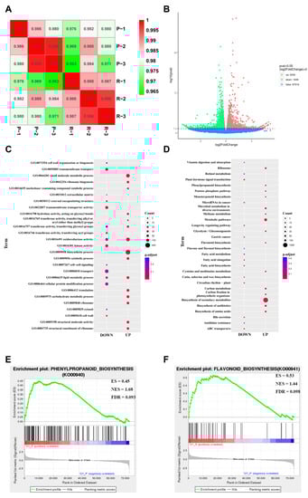 Differential expression analysis and enrichment analysis. (A) Results of Pearson correlation analysis among transcriptome samples. Red, relatively high correlation level; green, relatively low correlation level. (B) Volcano plot of differential gene expression analysis. Red, up-regulated genes in samples from red petal areas; green, down-regulated genes in samples from red petal areas. (C) GO enrichment analysis of DEGs. (D) KEGG enrichment analysis of DEGs. (E) Gene set enrichment analysis (GSEA) of phenylpropanoid biosynthesis pathway. (F) GSEA of flavonoid biosynthesis pathway. ES, enrichment score; NES, normalized enrichment score; FDR, false discovery rate.