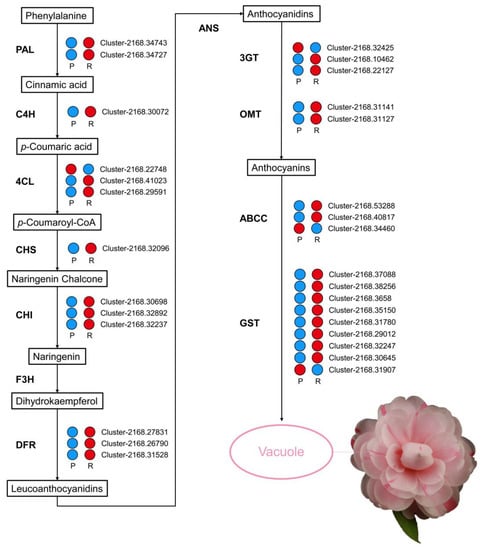 Functional enrichment analysis of DEGs identified numerous genes involved in anthocyanin biosynthesis. Consistent with their known roles in variation of flower pigmentation, PAL, C4H, CHS, CHI, and DFR were highly expressed in red petal regions, relative to samples from pink areas (Figure 3). Further, two genes encoding anthocyanidin 3-O-glucosyltransferases (3GTs) and two encoding O-methyltransferases (OMTs), which are responsible for anthocyanin glycosylation and methylation, respectively, were upregulated in red petal regions (Figure 3). Moreover, two ATB binding cassette C family (ABCC) genes, which encode anthocyanin transporters, were highly expressed in red, relative to pink, petal regions (Figure 3). GSTs serve as ligands in the transport of glutathione-conjugated anthocyanins to the tonoplast, and eight GST genes exhibited a trend toward being expressed at higher levels in red, relative to pink petal regions (Figure 3).
