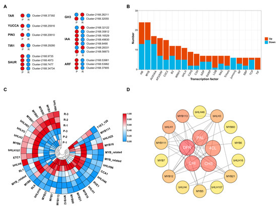 Differentially expressed genes (DEGs) involved in auxin signal transduction and differentially expressed transcription factors (TFs). (A) Heatmap of DEGs involved in auxin signal transduction. Red, up-regulated; blue, down-regulated. TAR, tryptophan aminotransferase-related protein; PIN3, PIN-FORMED3 (PIN3)-mediated auxin transport; TIR1, transport inhibitor response 1; SAUR, small auxin-up RNA; GH3, Gretchen Hagen 3; IAA, indole-3-acetic acid; ARF, auxin response factor. (B) Differentially expressed TFs in red and pink petal region samples. Red columns, up-regulated TFs; blue columns, down-regulated TFs. (C) Heatmap of differentially expressed MYB and bHLH TFs; each row was independently normalized according to FPKM value. Blue, low expression; red, high expression. (D) Protein-protein interaction network of genes involved in the MYB, bHLH, and flavonoid pathways; deeper color node indicates higher degree score.