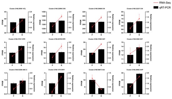 To further validate the above results, 12 genes related to flavonoid pathway and plant hormone signal transduction were selected for qRT-PCR analysis. To confirm primer specificity, the qPCR product was analysed by agarose gel electrophoresis, only single bands observed, indicating good specificity for the primers (Figure S2). Strong concordance between the transcriptome data and qRT-PCR results was observed (Figure 5), indicating the reliability of the transcriptome analysis results.