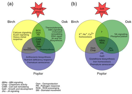 Main responses of birches, oaks, and poplars to drought (a) and salt (b) stress conditions. Overlapping circle parts represent the common stress responses.
