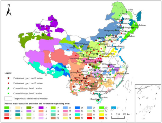 The layout of monitoring stations in national major ecosystem protection and restoration engineering areas(NMEPREA) (Numbers 1 to 37 represent NMPREA).
