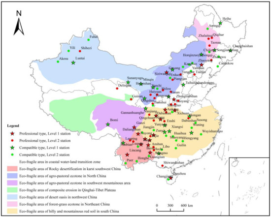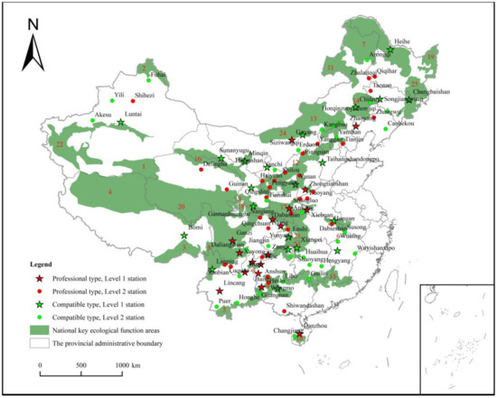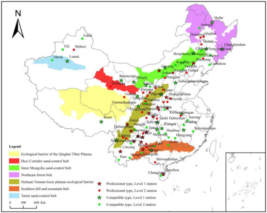 A total of 99 monitoring stations are arranged in the layout of the ecological monitoring system of the GGP, as shown in Table 4 and Figure 3. Among them, there are 10 in Northeast China, 21 in North China, 27 in East central and south China, 11 in Yunnan–Guizhou plateau, 4 in South China, 8 in the southwest alpine canyon area, 8 in forest and grassland area in eastern Inner Mongolia, 7 in Meng-Xin desert and semi-desert area, and 3 in Qinghai–Tibet plateau meadow and desert area. There are 51 compatible monitoring stations and 48 professional monitoring stations. In compatible monitoring stations, there are 20 level-1 station and 31 level-2 stations. Of the professional monitoring stations, there are 18 level-1 stations and 30 level-2 stations.