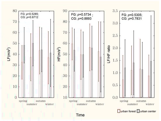 As shown in Figure 1, forest bathing decreased the levels of LF and LF/HF in different seasons. The levels of LF and LF/HF were lower in the FG than in the CG in autumn, while the HF level was higher in the FG than that in the CG (Figure 1).