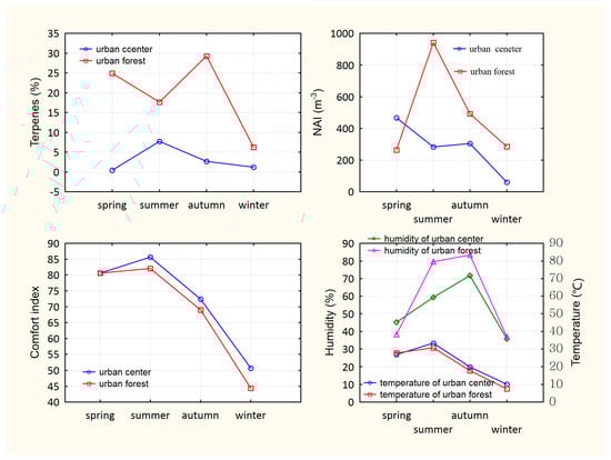 The negative air ion concentration in the urban forest was higher than that in the urban center in summer and autumn. Terpenes, the main components of VOCs, differed considerably across the four seasons. Overall, the terpenes of the urban forest were higher than those of the urban center, which is beneficial for human health (Figure 2). The air quality in the urban forest was better than that in the urban center; meanwhile, relative humidity in the urban forest was higher than that in the urban center in summer and autumn. Moreover, the temperature in the urban forest was lower than that of the urban center in summer and autumn, and the CCI of the urban forest was lower than that of the urban center, which indicated that the urban forest was a more comfortable site.