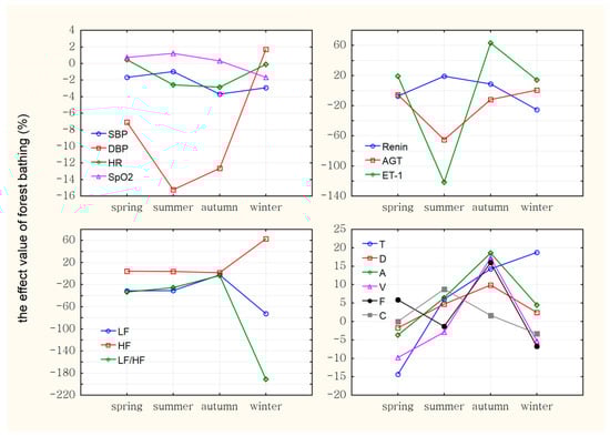 The effect of forest bathing was closely related to air quality and the atmospheric environment, with similar tendencies. As shown in Figure 3, the effect value of forest bathing in terms of SBP, DBP, and HR was decreased in spring, summer, and autumn, while SpO2 was increased, implying that it had an effect on depressurization and oxygenation. The effect value of forest bathing in AGT was decreased in spring, summer, and autumn, but there was no obvious change in winter, being close to zero. The effect value of forest bathing on ET-1 was declined sharply in summer and rose a little in spring and winter. The effect value of forest bathing in LF and LF/HF decreased sharply in winter, and slightly decreased in spring and summer. The effect value of forest bathing in terms of activity emotion (vigor/activity (V)) increased sharply in autumn, and negative emotions (depression/dejection (D), anger/hostility (A), and confusion/bewilderment (C)) decreased slightly in spring. The seasonal fluctuations in the effect value of forest bathing were highly consistent with the seasonal variations in air quality and the atmospheric environment. Similar trends were observed for air quality and the atmospheric environment, and for the effect of forest bathing; this suggests that the effect of forest bathing may be attributed to changes in air quality and the atmospheric environment.