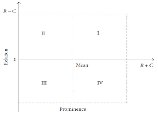 Figure 1 dash line ‘Mean’ corresponds to the threshold value and divides the graph into four quadrants. The factors in quadrant I correspond to core factors or intertwined givers since they have high prominence and relation. The factors in quadrant II are givers because they have low prominence but high relation. The factors in quadrant III have low prominence and low relation and are relatively disconnected from the system, therefore called independent factors or autonomous receivers. Finally, the factors in quadrant IV have high prominence, but low relation and can be called impact factors or intertwined receivers; these factors are impacted by other factors and cannot be directly improved.