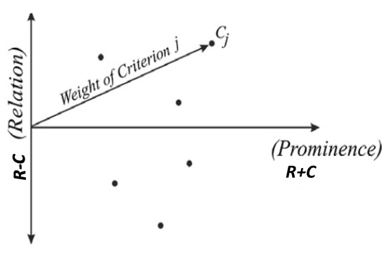 40] proposed Formula (7) to measure the relative importance of a factor (here criterion) which accounts for the interdependence from the cause-effect map and the interrelations between factors. Formula (7) represents the length of the vector in a graph (