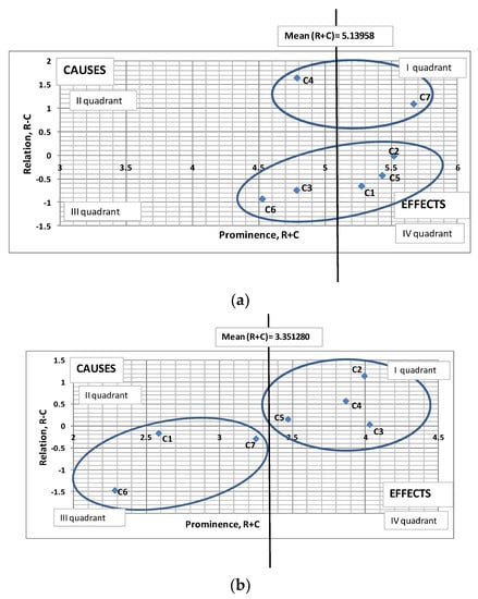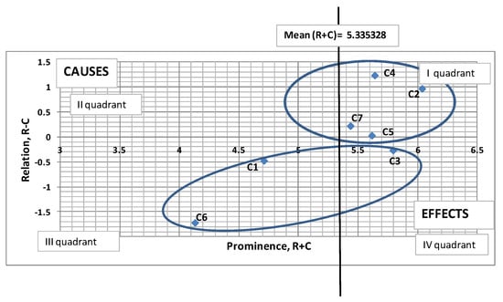 43]. Worth mentioning is that in some situations, the causal graph may be too complex to show valuable information for decision-making if all relations among factors are considered. The decision maker has to set a threshold value to indicate the influence level; if there are more decision-makers, this value can be set on a consensus basis, through discussions, or in another way. Most commonly, only the values greater than the threshold value are highlighted and are chosen for portraying in the form of a causal relationship map, acquired by plotting the values of (