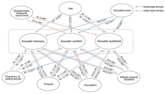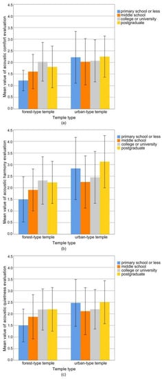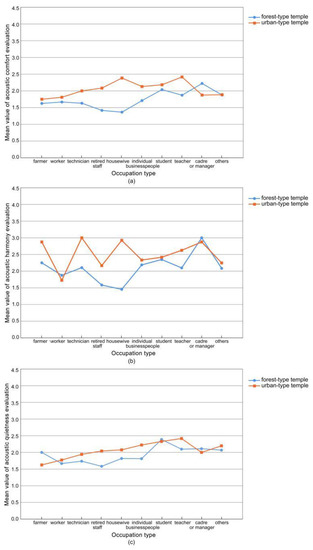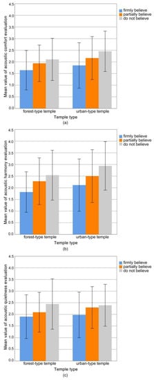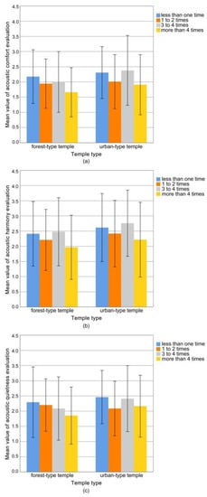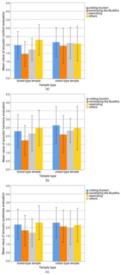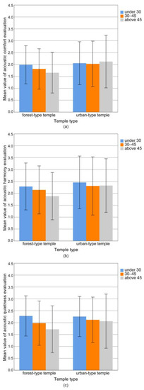 - What are the characteristics of respondents’ evaluations of the acoustic environment of forest-type and urban-type temples? Urban-type temples have a certain function for public activities, while forest-type temples have the functions of leisure and relaxation, similar to parks. Are the characteristics of their soundscape evaluations different from ordinary public spaces?