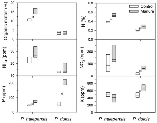 Figure 1. Differences between control (empty box-plots) and manure-applied (filled box-plots) trees of the two study species in soil chemical characteristics. Asterisks indicate significant (p < 0.05) differences between groups according to t tests.