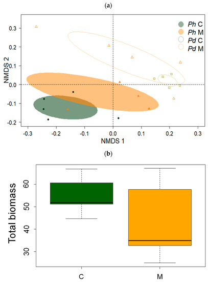 Figure 2. Comparisons of soil microbiota features between control (C) and trees subjected to manure application (M) in P. halepensis (Ph) and P. dulcis (Pd). (a) Multivariate analysis showing the biplot of scores of a non-metric multi-dimensional scaling (NMDS). The scores correspond to the first (NMDS1) and second (NMDS2) axes and are represented by different symbols (PhC—filled black circles; PhM—filled orange triangles; PdC—empty squares; PdM—empty orange triangles). Filled and empty ellipses group samples corresponding to P. halepensis (Ph) and P. dulcis (Pd), respectively. Green and orange colors indicate C and M trees. (b) Soil biomass values (y axes units are nanomoles of PLFAs per gram of soil) in P. dulcis showing higher values in control trees (see Table 2).