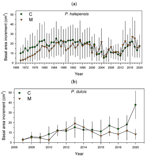 Figure 3. Tree growth (basal area increment) in control (C, green circles) and manure-applied (M, orange triangles) trees of the two study species: (a) P. halepensis; (b) P dulcis. Values are means ± SD.