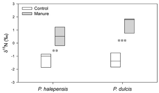 Figure 4. Values of δ15N in tree-ring wood of control (empty bars) and manure-applied (grey bars) trees of the two study species. The asterisks indicate significant differences between the two groups of trees in each species according to Dunn tests (P. halepensis, ** p < 0.01; P. dulcis, *** p < 0.001).
