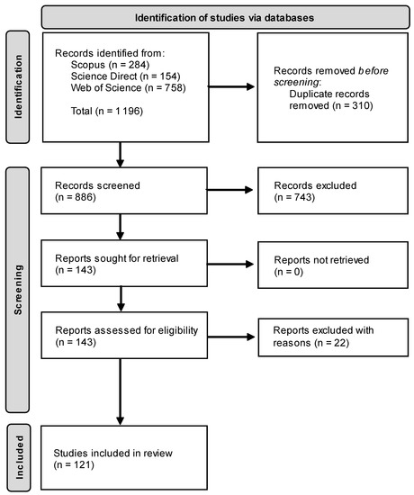 A total of 121 research articles that fit the search criteria and were considered eligible for further analysis were selected for inclusion in this review (Figure 1; Supplementary File S1). This equates to an overall average of approximately 12 publications per year on logging impacts within the Amazon biome. There was an increasing trend of publications on the subject, with the last two years having an average of 20 publications per year. These articles were published in a total of 60 different scientific journals. Journals only publishing one article on the subject were 34.7% of the total, journals that published two were 11.6%, three 12.4% and four or more 41.3%. The vast majority were published in Forest Ecology and Management (n = 27), followed by Ciência Florestal (n = 5), Forests (n = 5), Scientia Forestalis (n = 5), Biological Conservation (n = 4) and Biotropica (n = 4). The regions where these studies occurred were primarily in Brazil (n = 89), which accounted for 73.6% of all studies conducted in the biome. The remaining studies were encountered in French Guiana (n = 9), Guyana (n = 7), Peru (n = 6), Bolivia (n = 2), Ecuador (n = 2), Suriname (n = 2), Venezuela (n = 1) and multiple regions (n = 3). For the multiple regions, the studies included: Guyana and Suriname; French Guiana and Brazil; and Bolivia, Guyana and Brazil. No studies fitting the search criteria for this review were found in Colombia.
