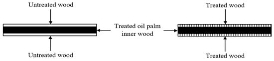 Oil palm trunk is frequently used as a raw material in the manufacture of composite materials such as laminated veneer lumber (LVL); plywood, flooring, furniture, and other composites [9,10,11,12,13,14,15]. However, it was reported that oil palm wood extracted from the trunk has four major drawbacks, i.e., low mechanical strength, inferior dimensional instability, poor durability, and poor machining characteristics [16,17]. As a result, Haslett [18] concluded that the oil palm trunk is unsuitable for use as sawn timber. Instead, it can be used to make reconstituted value-added wood-based products such as particleboard, fiberboard, and laminated board. Markedly, treatment is still required in the fabrication of laminated boards. According to a recent study, chemical treatments may improve the outer and inner surfaces of oil palm wood (OPW). Hill [19] discovered that increasing the bulk of low-density wood improves its quality.