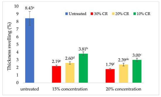 Figure 2 shows that the TS value of untreated OPW was 8.43%. The TS of compreg OPW ranged from 1.79% to 3.81%. When compared to samples with a 15% resin concentration, samples with a 20% resin concentration had lower TS values. Meanwhile, CR had a significant impact on the TS of the samples, i.e., the higher the CR (30%), the lower the TS values.